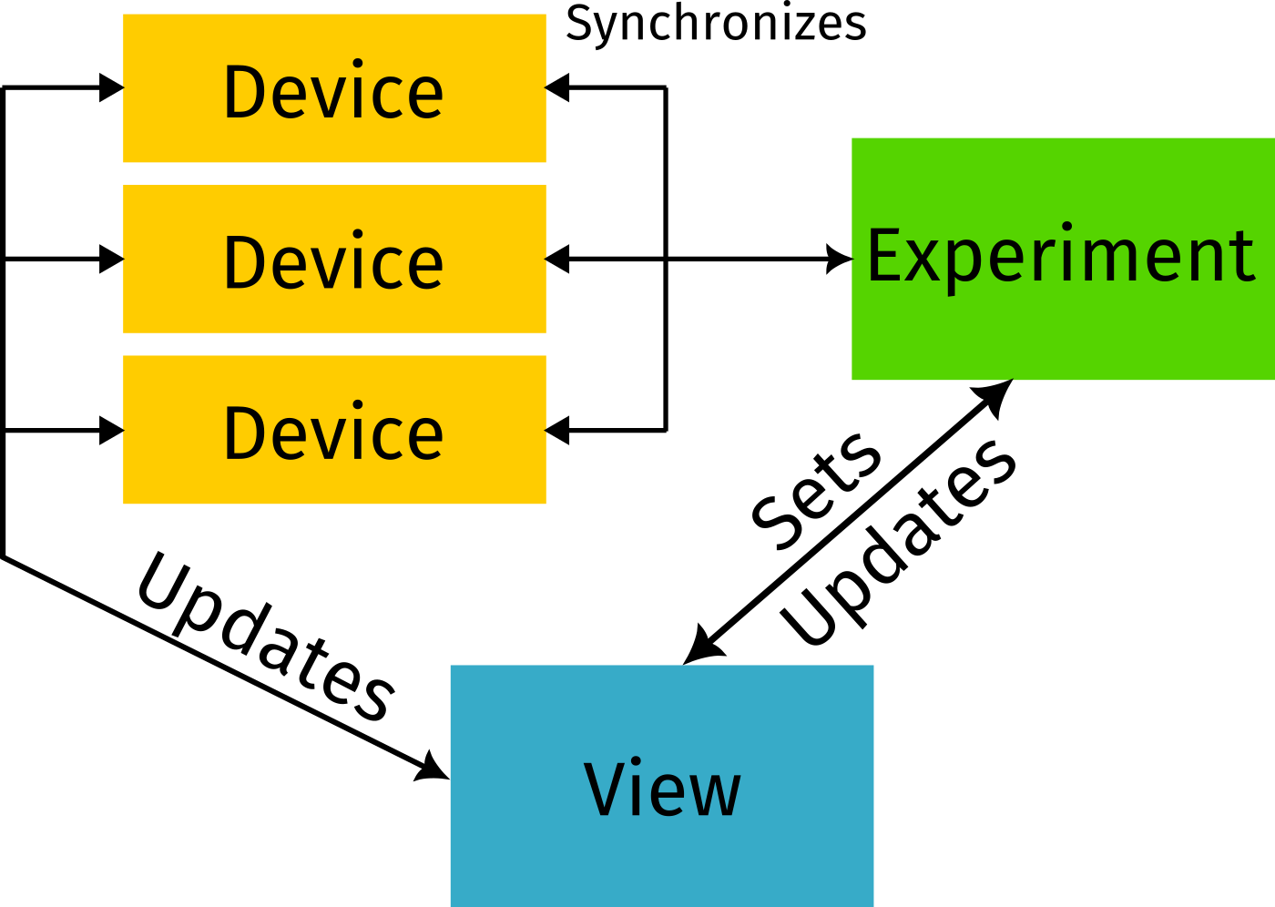 Finally, the view is the interface that gets presented to the user. In this case, there are many different use-cases: A GUI can be useful for some contexts, while for others a command-line-interface will be enough. Another interesting pattern to explore is the use of Jupyter Notebooks, where code can be dynamically altered (for instance, it is possible to subclass a device and change one of its methods, etc.)